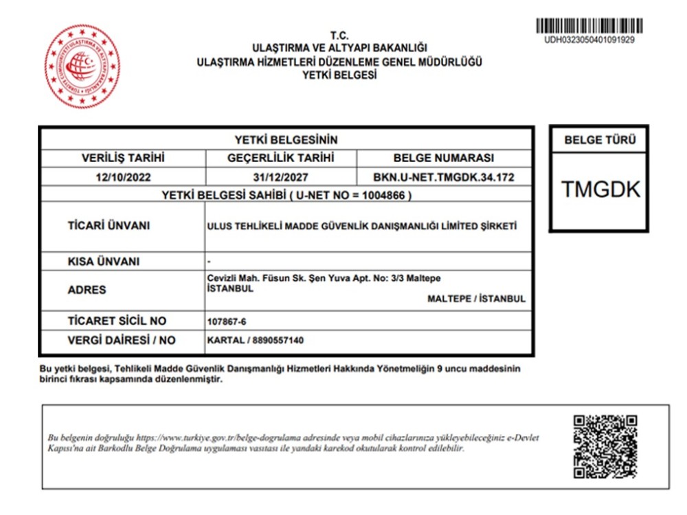 TMGD danışmanlığımızı bir ileri aşamaya taşıyarak Ulaştırma Bakanlığından Tehlikeli Madde Güvenlik Danışmanlığı yetki belgemizi aldık.
